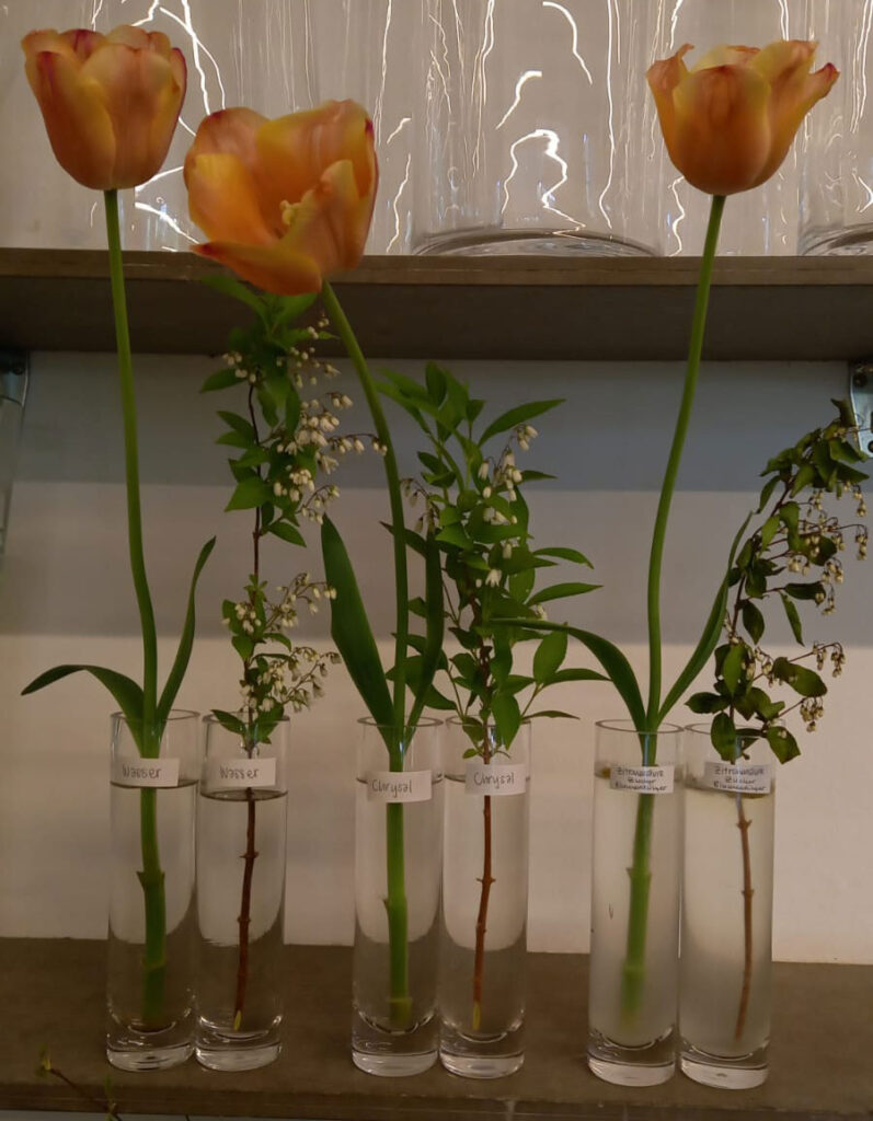 Laib liess sich vom Dorfdrogisten ein Rezept zusammenstellen und testete die biozid-freie Mischung aus Zucker und Zitronensäure. Sie stellte drei Tulpen und einen Grünzweig in je drei Väschen: eines mit Leitungswasser, eines mit dem Zusatz vom Drogisten und eines mit Blumen-Frischaltemittel. Ihre Mitarbeitenden dokumentierten laufend den pH-Wert und machten täglich ein Foto der Blumen.
