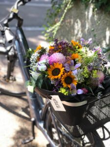 Unser Vorteil: So können wir uns die Nassverpackung sparen, denn wir transportieren die Blumen in einem Gefäss, das mit Wasser gefüllt ist. Wir nehmen die Blumen erst kurz vor dem Klingeln aus dem Wasser (Handtuch mitnehmen!) und übergeben der beschenkten Person die Blumen im allerbesten Zustand.