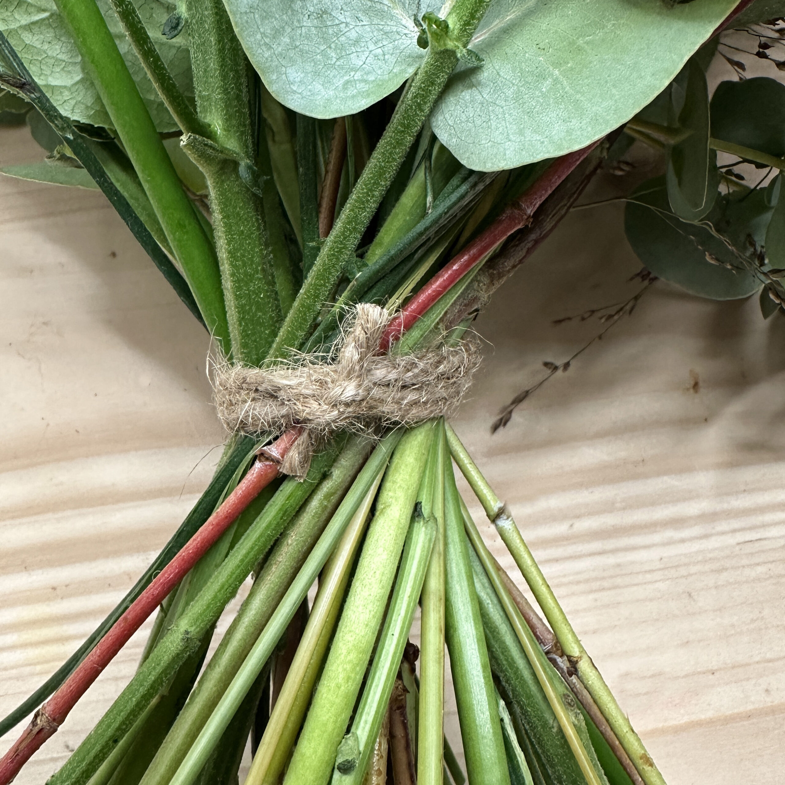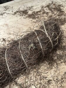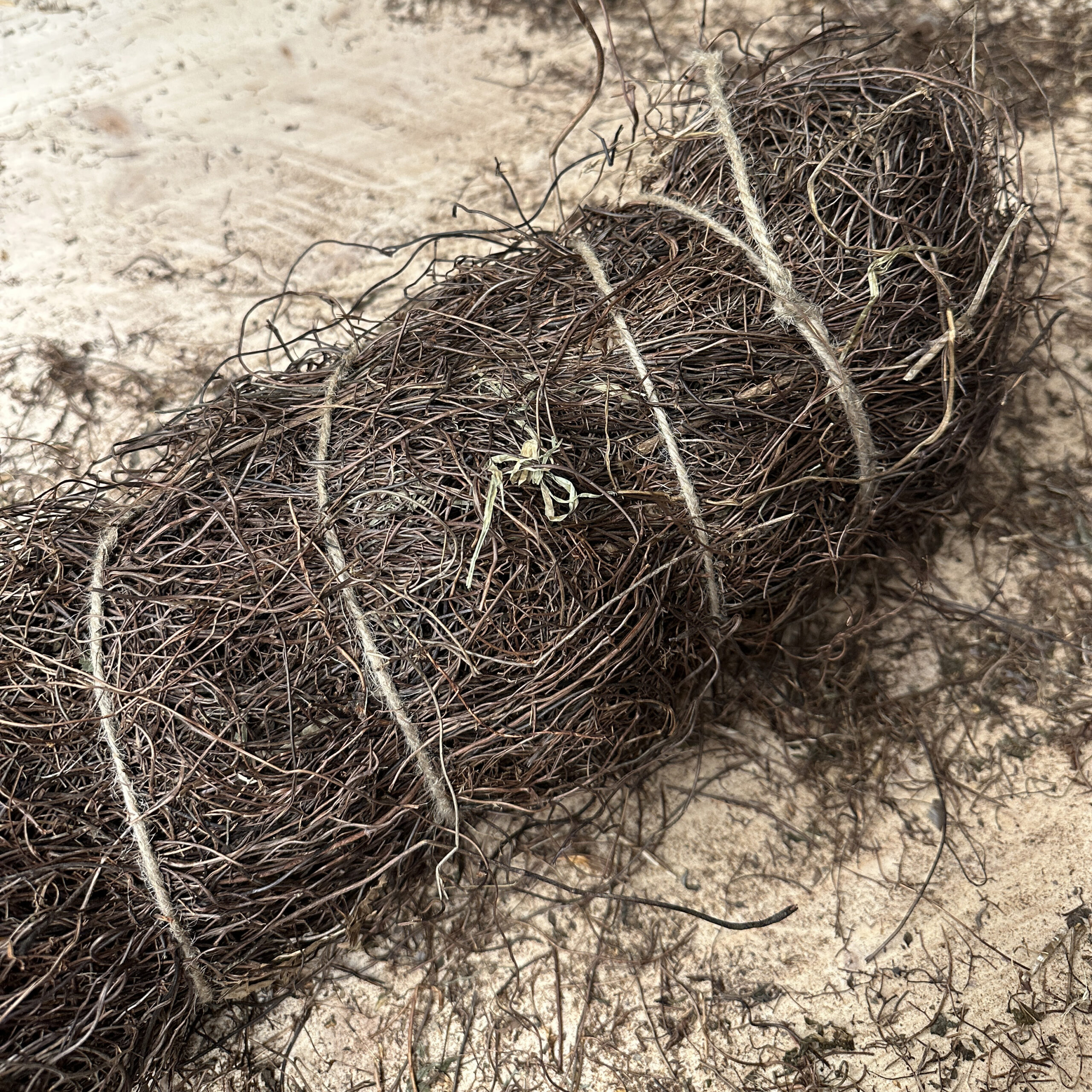 Mühlenbeckia ist ein beliebter Werkstoff bei uns. Doch wir sind nicht nur am Inhalt des Bündels interessiert, auch die Schnur drumherum ist wertvoll für uns. Ganz nach dem Prinzip «nose to tail» versuchen wir nämlich, alles zu verwerten und nicht nur das «Filetstück».